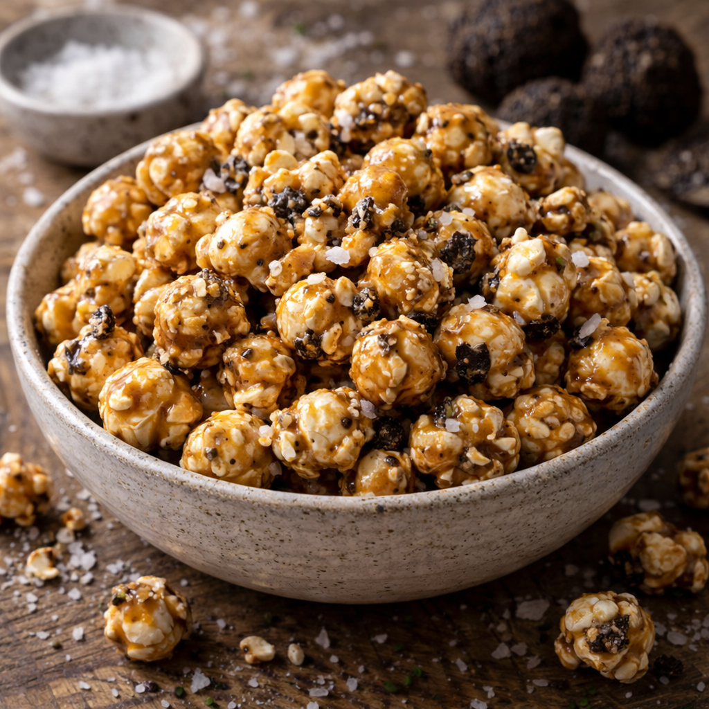 Popcorn, Karamell (Zucker, Glukosesirup), Pflanzenfett (Rapsöl), Meersalz, Pilzölextrat, 1,7 % getrockneter Trüffel, Emulgator: Sojalecithin, Säureregulator : Weinsäure. !enthält Soja, kann Spuren von Nüssen enthalten!